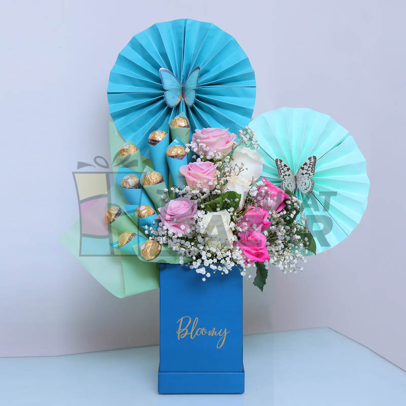 Every love story deserves that magical ever after, in a land where love lasts forever, and the skies are nothing but bright blue. Bring her that very feeling of enchantment, and true love with a bouquet just as magical as her! Our Blue Bird – with kisses of soft pink & whites roses, Ferrero chocolates, Paper hand work and beautiful butterfly all arrange in Bloomy Box, is an arrangement sure to make all her dreams come true.