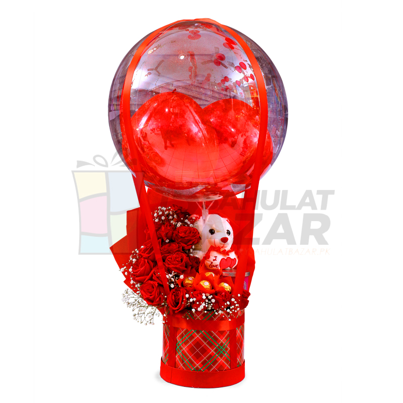 This Red arrangement for some one special in your life. Combination of Red Roses with chocolates and teddy arrange in red box with ribbon balloon.