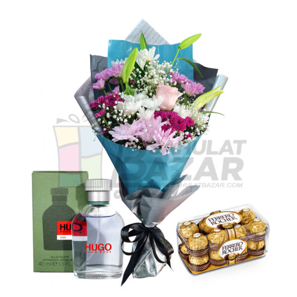 Hugo perfume for him with 16 Pcs Ferrero Rocher Box and Imported Flowers of Lilies, Chrysanthemum and Roses.