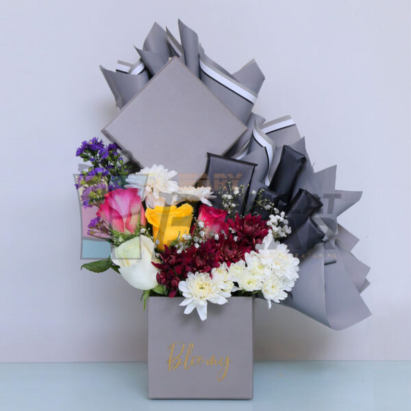 Brighten someone’s day with the finest bloomy box brimming with the sweetest blossoms – decked with the loveliest roses with chrysanthemum and wrapped chocolates, this fresh flower arrangement is truly the ideal gift when expressing your true love and admiration for your loved one.